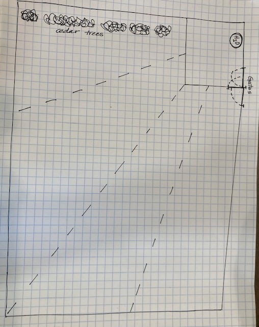 The deer pen spans across 5 acres and contains a catch pen within it. We have plans to add additional fencing to break the large pen up into 4 pens for future sorting. These inner pens will all have a gate opening into the catch pen and will radiate out from there. This design will help reduce having 90 degree corners that make it difficult to round up the deer into the catch pen. I have included a drawing of our future pen design below.